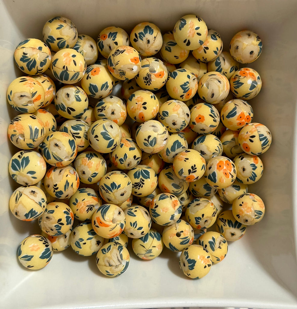 Yellow Leafs Print Silicone Beads - 10 Per Bag